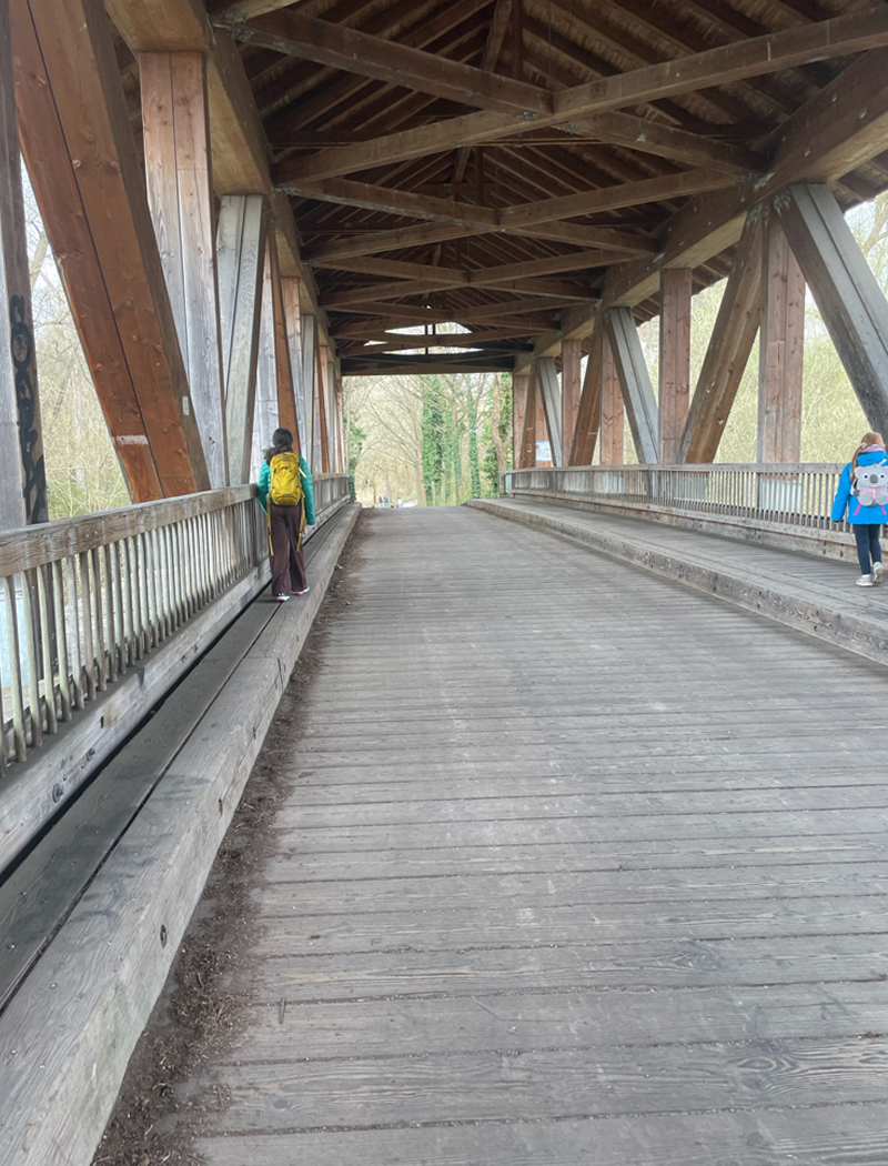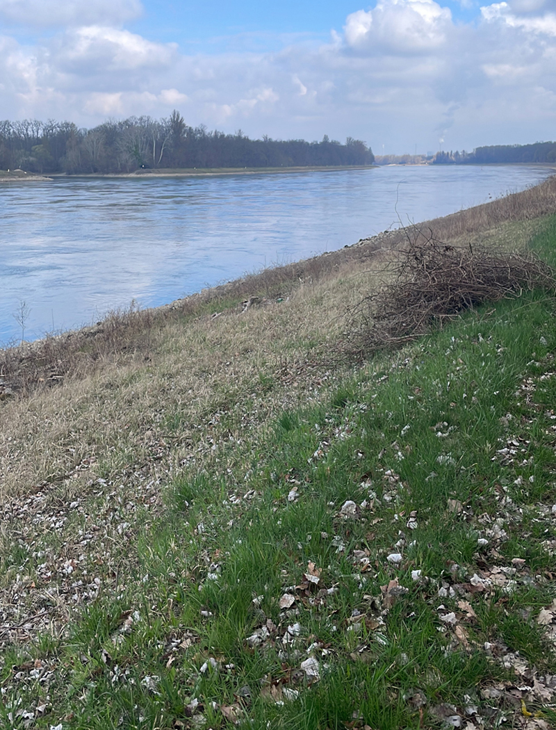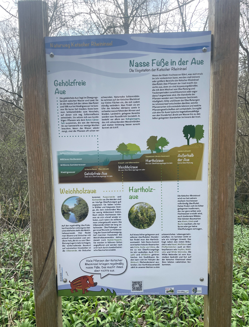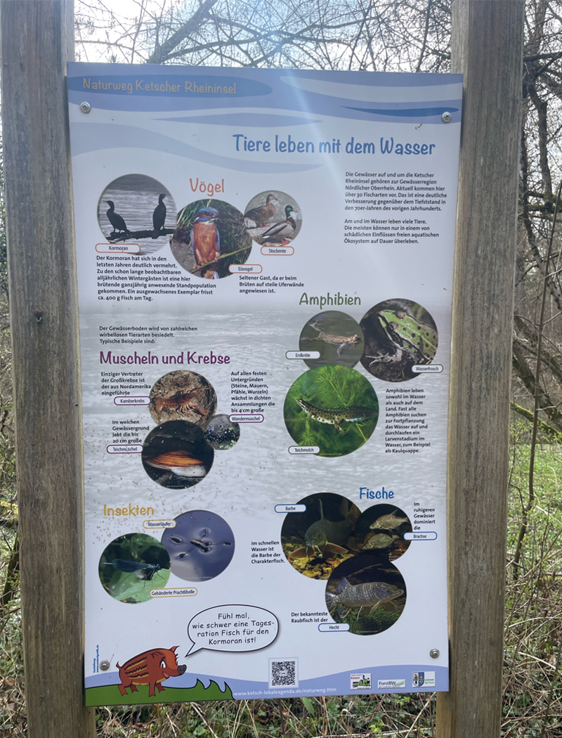 Dort legten wir eine kurze Rast ein, stärkten uns und beobachteten den vorbeiziehenden Schiffsverkehr. Danach ging es flussabwärts weiter bis zum Rhein-Flusskilometer 406. Mit einem letzten Blick auf die Kollerfähre führte unser Weg anschließend in Richtung Wildschweingehege auf der Rheininsel, wo wir eine weitere Pause einlegten. Eine besondere Überraschung erwartete uns dort: Der Engländer George spielte auf seiner Gitarre Songs von Johnny Cash und Metallica - eine perfekte musikalische Begleitung, die wir so nicht bestellt hatten, die aber wunderbar passte.
