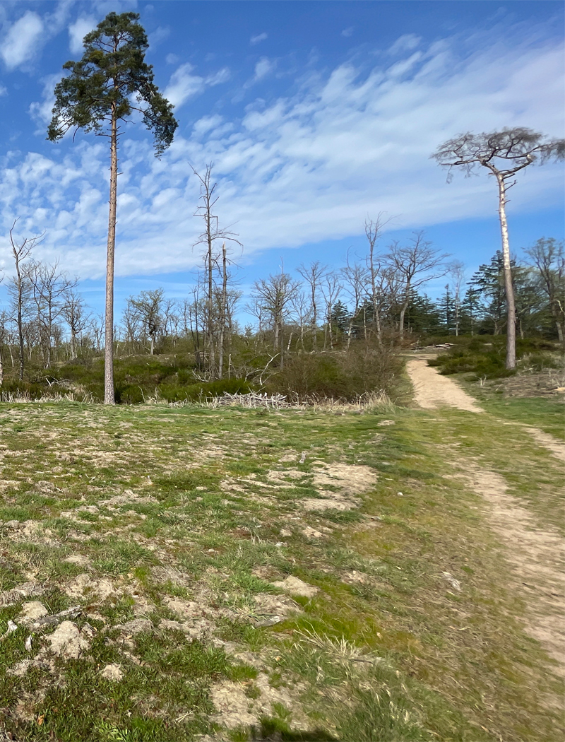 Der große Regen blieb am Sonntag allerdings aus – dennoch muss man sich mittlerweile ernsthafte Sorgen um unser Naherholungsgebiet Hardtwald machen. Viele abgebrochene Kiefernbestände, große Lichtungen und dichter Unterwuchs, insbesondere Ginster, prägen zunehmend das Landschaftsbild des Oftersheimer Waldes. Auch in der Rhein-Neckar-Zeitung (Ausgabe 83) wird aktuell darüber berichtet. Der Klimawandel hat hier deutliche Spuren hinterlassen: Sandige Böden, anhaltende Trockenheit und die ungewollte Ausbreitung der Kermesbeere setzen den heimischen Baumarten erheblich zu.